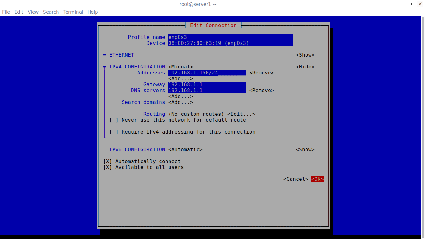 Кроме того, вы можете использовать команду nmtui для настройки IP-адреса.