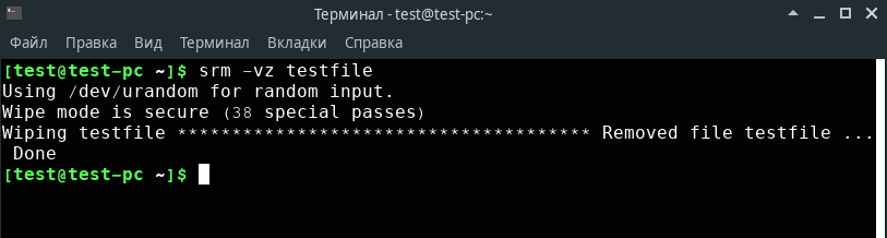 Поскольку был создан небольшой файл, процесс очистки займет примерно одну-две минуты. Если необходимо удалить гораздо более громоздкий файл, то работа утилиты srm займет больше времени. Необходимо запастись терпением, иначе процесс очистки потерпит неудачу, и данные останутся на диске.