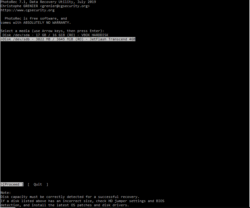 3. С помощью клавиш со стрелками вверх и вниз выберите диск, который вы хотите восстановить, затем с помощью клавиш влево и вправо выберите Proceed и нажмите Enter. Если выбранное устройство состоит из нескольких разделов, PhotoRec отобразит все разделы и позволит выбрать раздел, в котором находился удаленный файл. С помощью кнопок со стрелками вверх и вниз выберите поиск и восстановление файлов из свободного пространства диска или со всего диска.