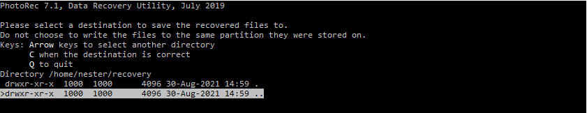 5. Выберите путь назначения для восстановленных файлов. Нажатие Enter приведет к открытию каталогов. Когда все будет готово, нажмите C, чтобы задать место назначения и запустить процесс восстановления.