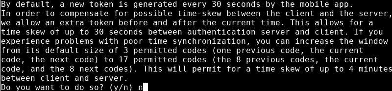 ШАГ 1 - Вам будет предложено выбрать токены аутентификации на основе времени. Токены аутентификации по времени будут генерировать новый код каждые 30 секунд. Нажмите «y», чтобы продолжить.