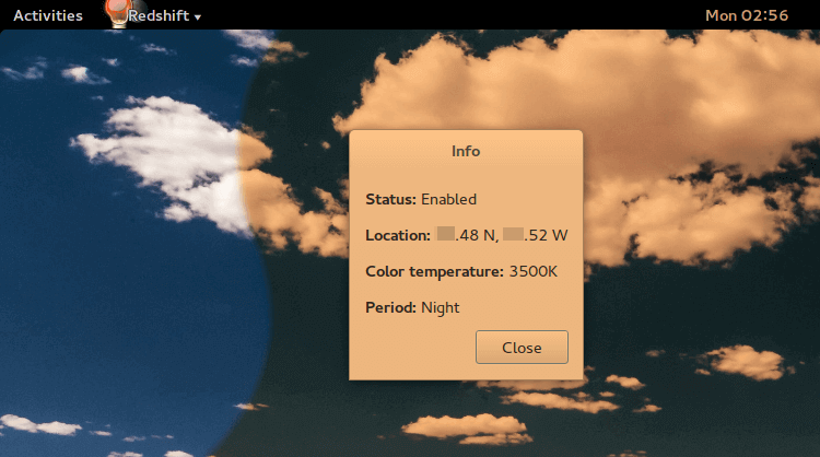 Redshift GUI - это форк Redshift, созданный разработчиком, потому что он хотел версию приложения с графическим интерфейсом, которая делает его намного проще в использовании. Установите один из пакетов, укажите свое местоположение, и все готово. Другие функции включают в себя регулировку температуры и т.д.