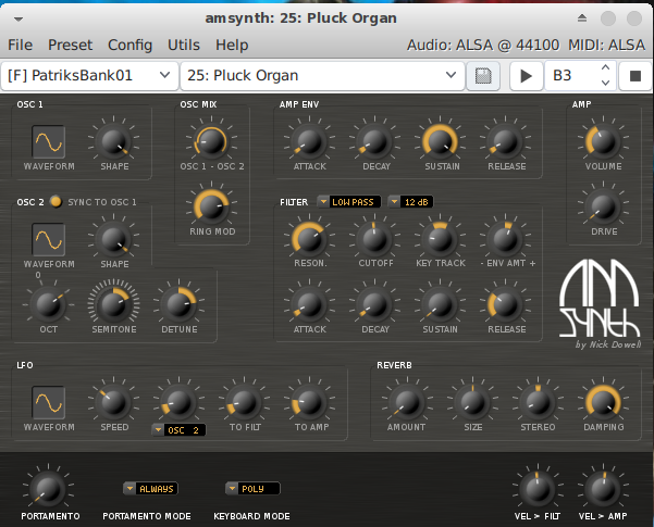 amSynth - это программное обеспечение для создания цифрового аудио в реальном времени. В нем реализовано множество операций, схожих с аналоговыми Moog Minimoog и Roland Juno-60, воплощением классических синтезаторов 70-х годов. Два основных осциллятора этого программного синтезатора поддерживают пять различных циклических форм волны и один источник шума с жесткой синхронизацией.
