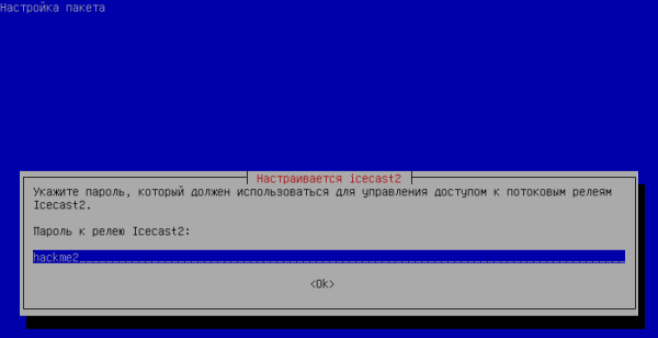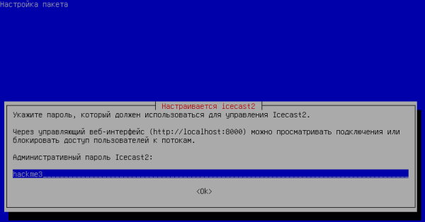 И наконец, вводим пароль пользователя admin. Вы будете использовать его для доступа к разделу администратора веб-интерфейса Icecast. Измените значение по умолчанию на уникальное:
