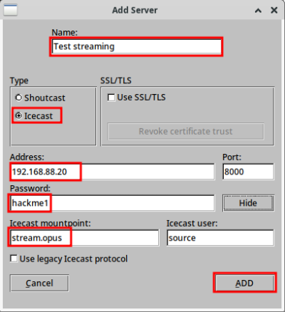 Выберите имя для конфигурации этого сервера (поддерживается несколько конфигураций сервера) и выберите радиокнопку «Icecast». Введите IP-адрес и порт (по умолчанию 8000) вашего сервера Icecast, а также пароль источника. В поле «Icecast Mountpoint» добавьте в конце .OPUS (добавление расширения помогает некоторым клиентам-слушателям определить, какой кодек используется). Оставьте «Icecast User» в качестве источника и снимите флажок «Use legacy Icecast protocol». Нажмите «Add», а затем в родительском окне нажмите «Save».