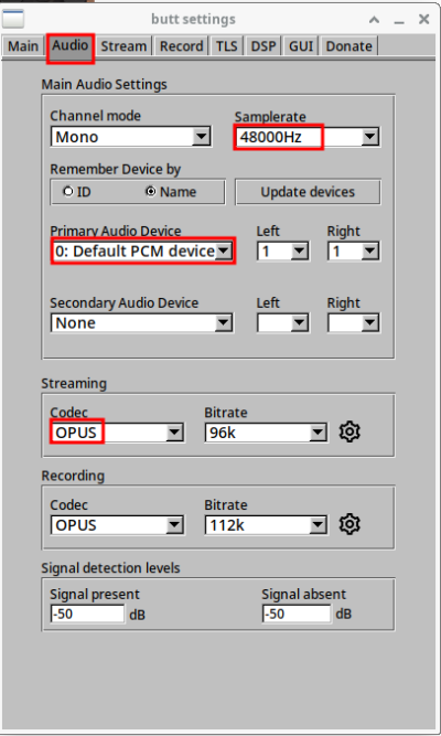 В разделе « Settings » перейдите на вкладку «Audio». Установите «Samplerate» на 48000 Гц (требуется для Opus), проверьте, чтобы в «Primary Audio Device» был подключен ваш микрофон, и установите «Streaming Codec» на Opus: