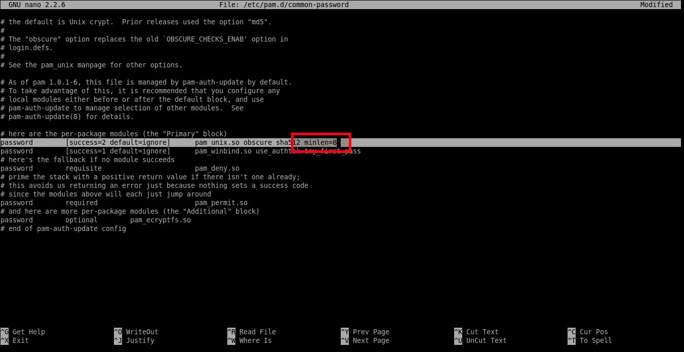 И добавьте в конце строки minlen = 8. В данном случае я устанавливаю минимальную длину пароля равное 8 символам.