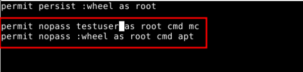 permit nopass testuser as root cmd mc permit nopass :wheel as root cmd apt