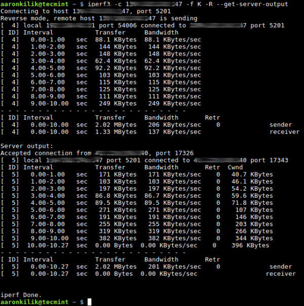 $ iperf3 -c 192.168.10.1 -f K -w 500K -R --get-server-output