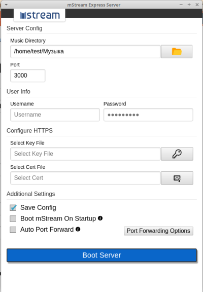 После запуска mstreamExpress интерфейс конфигурации сервера отобразится, как показано на следующем снимке экрана. Введите параметры конфигурации и нажмите на Boot Server.