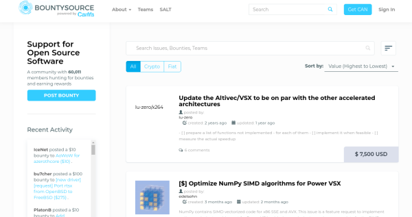 Кроме того, есть специальный раздел “Salt”, который представляет собой функцию периодических пожертвований, которая позволяет людям ежемесячно вносить вклады в команды или проекты на платформе. Исходный код BountySource доступен на GitHub.
