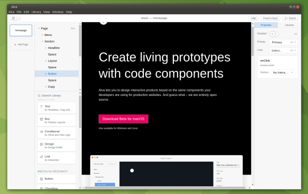 Alva - это еще один инструмент прототипирования с открытым исходным кодом в нашем списке. Его разработка началась в 2017 году, и в настоящее время он работает на всех основных операционных системах (Windows, macOS и Linux). Пользовательский интерфейс Alva весьма современен и стилен по сравнению с другими программами из этого списка.